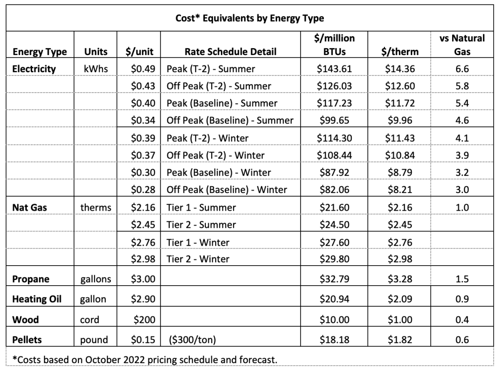 If we compare the different residential energy sources used for space heating (water heating and cooking fuels are limited to natural gas, propane, and electricity) the lowest cost for heating energy (per therm or BTU) is firewood, followed by heating oil, and propane while electricity is the highest. Because of the way PG&E’s rates are scheduled a customer may have four different prices (Baseline Peak, Baseline Off-Peak, Peak, and Off-Peak rates) for electricity in a single billing period. During the summer electricity may be 5 to 7 times more costly per BTU than natural gas, while in the winter because of higher natural gas prices and lower electrical costs, electricity is only 3 to 4 times more costly on a BTU basis.