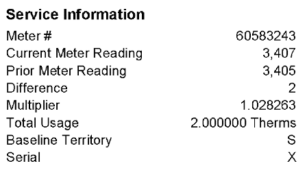 Natural gas is metered at our homes in cubic feet (cu.ft.) but we are billed by the “therm”. One therm is 100,000 BTUs (British Thermal Units) of heat energy. One cubic foot of natural gas is approximately 1,037 BTUs of heat energy. The heat energy content of natural gas varies requiring PG&E to use a multiplier that is based on the energy content of natural gas as tested by the utility company. If you look at a portion of my most recent gas bill you will see the cubic feet to therm multiplication factor is 1.028263. A cubic foot of natural gas in this case is equal to 1,028 BTUs.