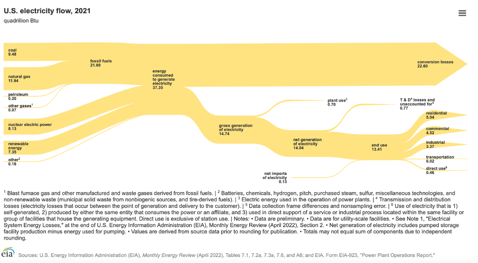 The primary way we produce electricity is known as thermal electricity production. A combustible material such as coal, natural gas, and/or wood is mined, pumped, or cut down and burned to heat water to make steam. A lot of energy and multiple transitions went into making fossil fuels, of which only a small portion ends up producing electricity. Steam energy is spins a generator that produces electricity. The waste heat has to be ejected into the atmosphere to cool the steam so that it can be heated again to make steam. According to the Department of Energy’s (DOE) Energy Information Agency (EIA) about 60% of the energy content of fossil fuels is wasted in generation process.