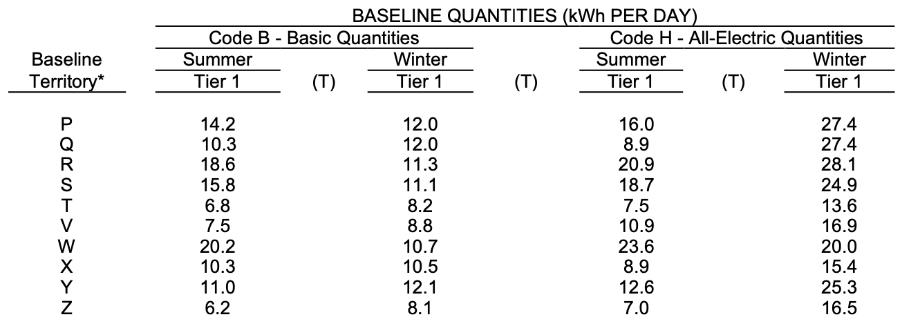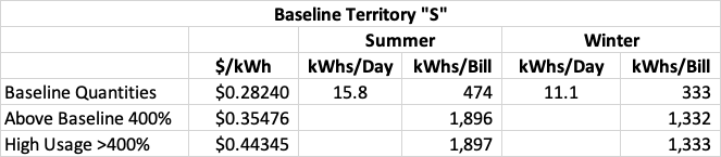 Let’s say there are 30 days in a billing cycle and you live in Baseline Territory “S” and have gas heating, your baseline allocation (Tier 1 quantity) for that billing cycle would be 474 kWhs in the Summer and 333 kWhs in the Winter.
