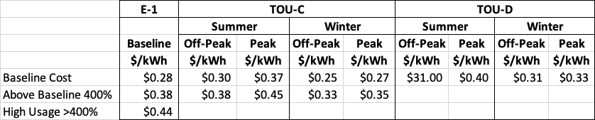 PG&E is migrating all of their Residential E-1 Rate customers to the TOU-C Rate, with some exceptions which will be discussed below. Time-of-use rates have been around for a while. They are useful for people who aren’t at home during peak hours or who use very little energy. A time-of-use schedule allocates costs based on the time a customer uses electricity. In the past there has been very little use of electricity during the night and early morning and on weekends and the off-peak rate was significantly lower, unlike today. These were useful for charging electric vehicles or having indoor grow operations.PG&E has a few TOU rate plans with different peak and off-peak periods. “Peak” is between 4 – 9 PM (TOU-C) or 5 – 8 PM (TOU-D).