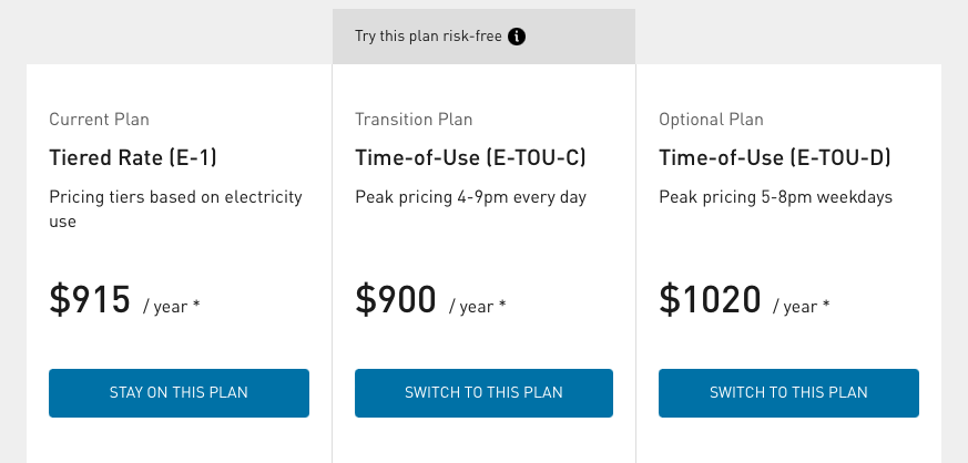 On your account page on PG&E’s website you can access a rate comparison tool. A third-party provider analyzes your current energy consumption and calculates how much you use and when (based on smart meter analysis) and compares the different rates. The graphic below is from that webpage and shows that I would save $15/year by switching to the E-TOU-C. I personally do not trust this analysis because as I have shown in the table above the lowest E-TOU-C rates are higher than the E-1 rates; therefore, it is impossible to cost less when the cost per kWh is more. In fact, the letter I received from PG&E about the April 19, 2022 transition to the E-TOU-C rate stated that it will cost me about $50/year more than staying on the E-1 rate. Your costs and savings will be different than what I’ve shown below as your usage is different than mine.