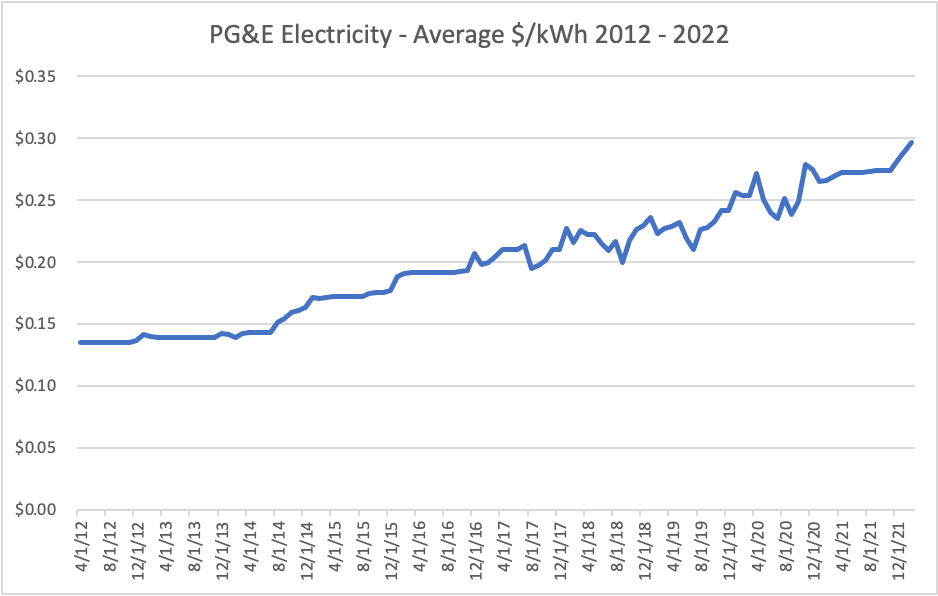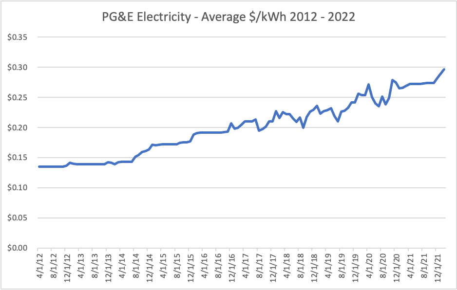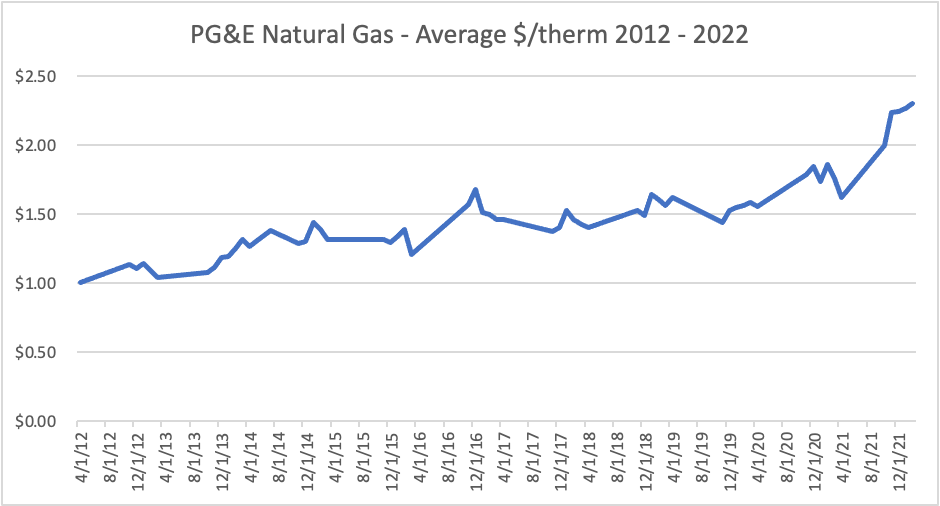 PG&E’s natural gas prices have also drastically increased over the past ten years from around $1.00/therm in 2012 to $2.30/therm at the start of 2022, an increase of 230% while inflation was around 24% for the same time period.